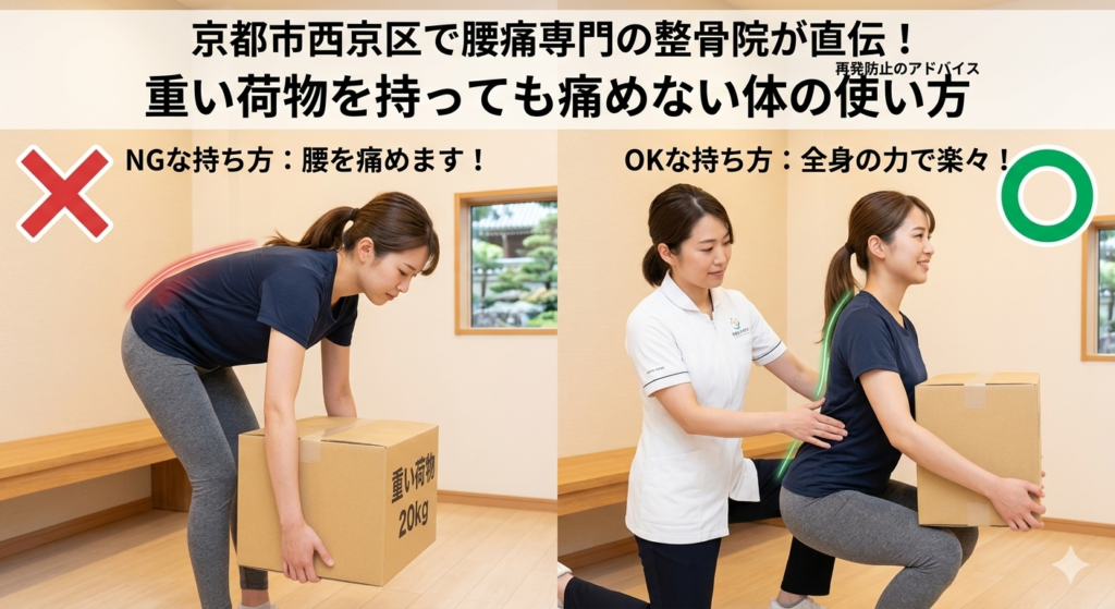 「あっ、やってしまったかも……」重い荷物を持ち上げようとした瞬間、腰に走る嫌な緊張感。京都市西京区上桂で多くの腰痛患者様と向き合っている当院では、日常の何気ない動作で腰を痛めてしまったというご相談を毎日いただきます。実は、重いものを持ったから腰を痛めるのではありません。「腰を痛める持ち方」をしているから痛めるのです。今回は、プロが現場で指導している「一生モノの体の使い方」を伝授します。